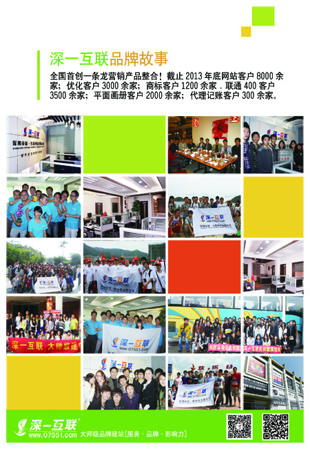 全國首創一條龍營銷產品整合!截止2013年底網站客戶8000余家;優化客戶3000余家;商標客戶1200余家.聯通400客戶3500余家;平面畫冊客戶2000余家;代理記賬客戶300余家。